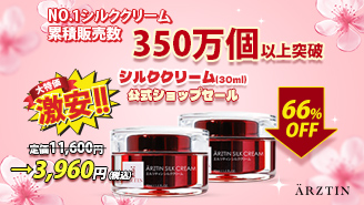 【シルククリーム(30ML)」エルツティン公式ショップ販売開始のイベント エルツティンの人気商品” シルククリーム ”は販売累積数350万個突破!メイクの前後にレイヤリングするとさらにもっちりとした肌に仕上がりますエルツティンの人気商品【シルククリーム(30ML)】がセットでセールイベント!66%安く公式ショップで販売します。『セール情報』* 販売価格 1,980円(税込):シルククリーム(30ML)->定価5,800円相当、約66%OFF->公式Amazonのみ販売中。* 販売価格 3,960円(税込)3,960円(税込):シルククリーム(30ML)2個+シルククリーム20g1個+シルクトナー20ml1個セット-> 定価11,600円相当、約66%OFF*詳細は画像を要チェックして下さい。【販売先】エルツティン公式㏋、公式Qoo10ショップ、公式楽天ショップ、公式Amazonエルツティンの【シルククリーム(30ML)】イベントをぜひ、お見逃しなく!(´▽`ʃ♡ƪ)エルツティンのご購入先は下記をチェック エルツティン公式Qoo10ショップhttps://qoo10.jp/shop/arztinjp/エルツティン公式楽天ショップhttps://rakuten.ne.jp/gold/arztin/ エルツティン公式HPhttps://arztin.co.jpエルツティン公式アマゾンショップ https://amazon.co.jp/b?node=2628648