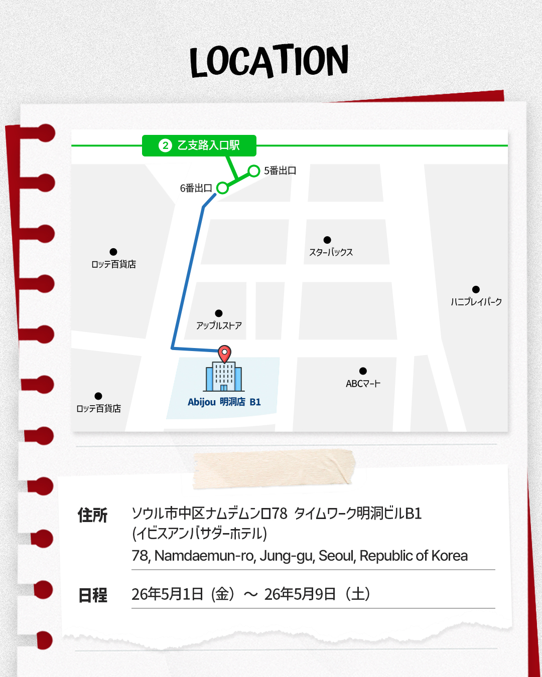 - 場所:ソウル市中区 ナンデムロ78, タイムワーク明洞ビル B1