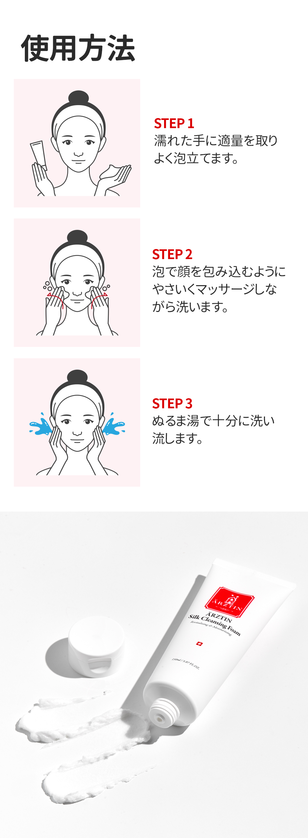 濡れた手に適量を取り、よく泡立ててから顔全体をやさしくマッサージするように洗います。その後、ぬるま湯で十分にすすぎます。
